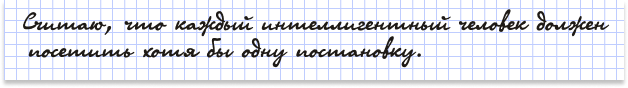 Я люблю театр, особенно спектакли по классическим произведениям. Сама посещаю и беру с собой учеников. Отдельное удовольствие видеть и слышать эмоции ребят.